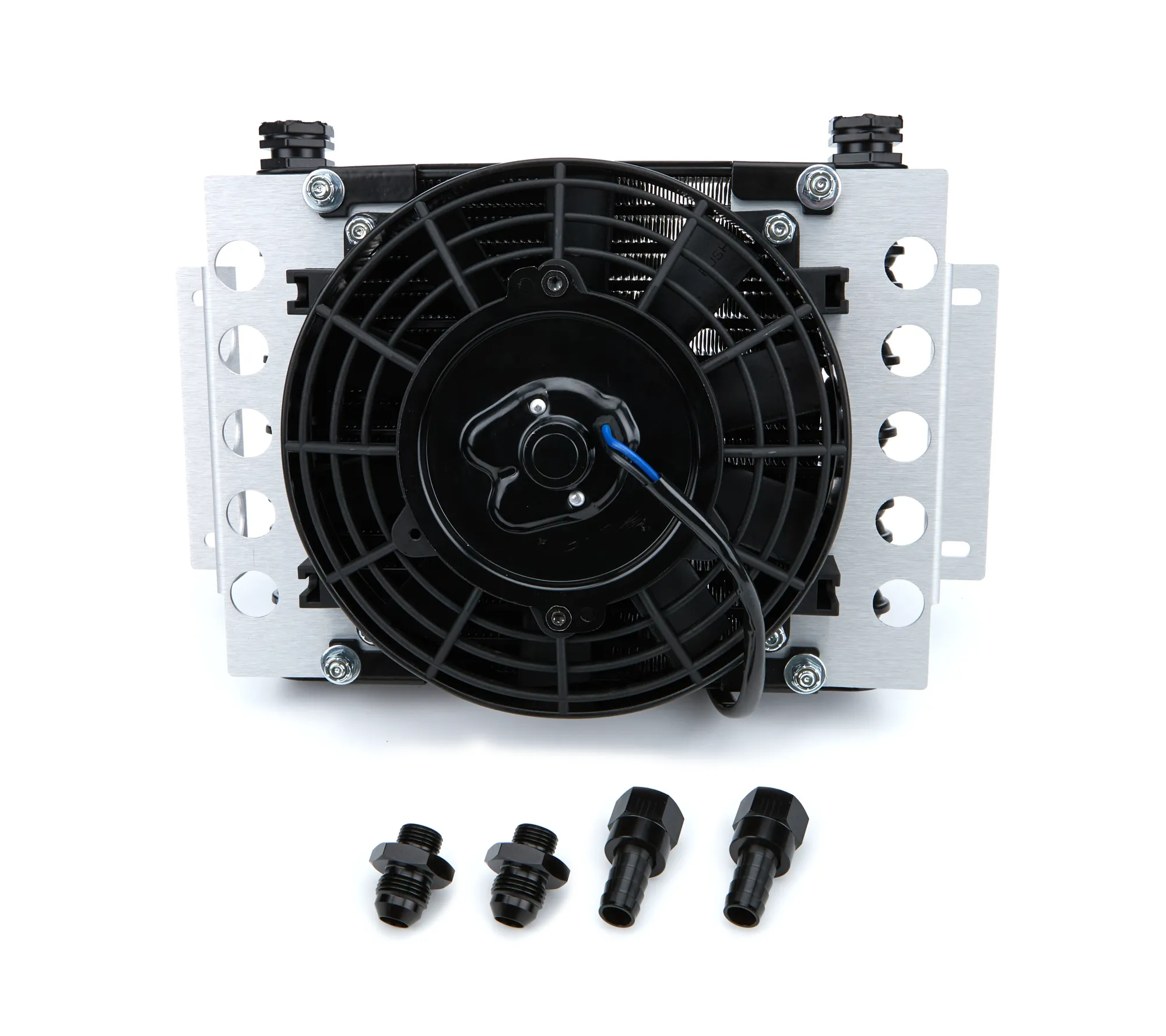 Fluid Cooler and Fan – 12.75 x 9.375 x 4.313 in – Plate and Fin Type – 5/8-18 in Female O-Ring Inlet / Outlet – 8 AN Male Adapters – Fittings – Aluminum – Black Powder Coat – Universal – Each