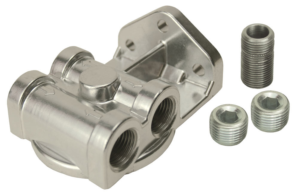 Oil Filter Mount – Side Port Style – 1/2 in NPT Female Dual Ports – 13/16-16 in Center Thread – Aluminum – Polished – Universal – Each