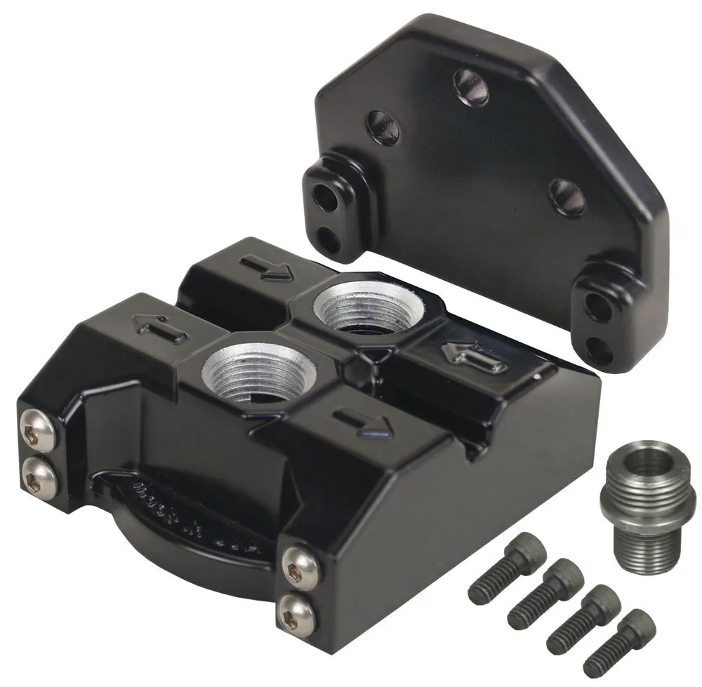 Oil Filter Mount – Premium – Ports Up – 10 AN Female O-Ring Ports – 3/4-16 in Center Thread – Aluminum – Black Powder Coat – Universal – Each