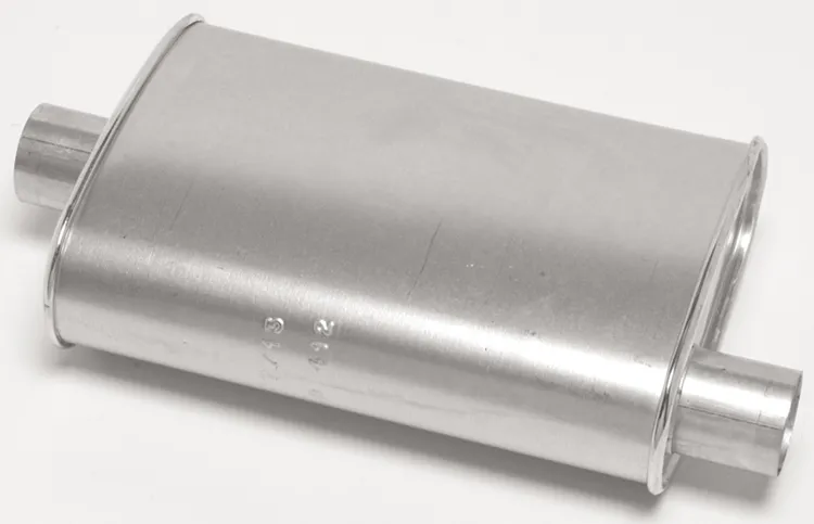 Muffler – Thrush Turbo – 2.25 in Offset Inlet – 2.25 in Center Outlet – 14 x 4.25 x 9.75 in Oval – 18.5 in Long – Steel – Aluminized – Universal – Each