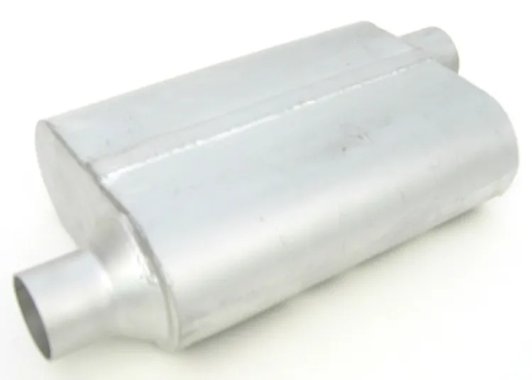 Muffler – Thrush Welded – 2.25 in Offset Inlet – 2.25 in Offset Outlet – 13 x 4 x 9.5 x 6 in Oval Body – 19 in Long – Steel – Aluminized – Universal – Each