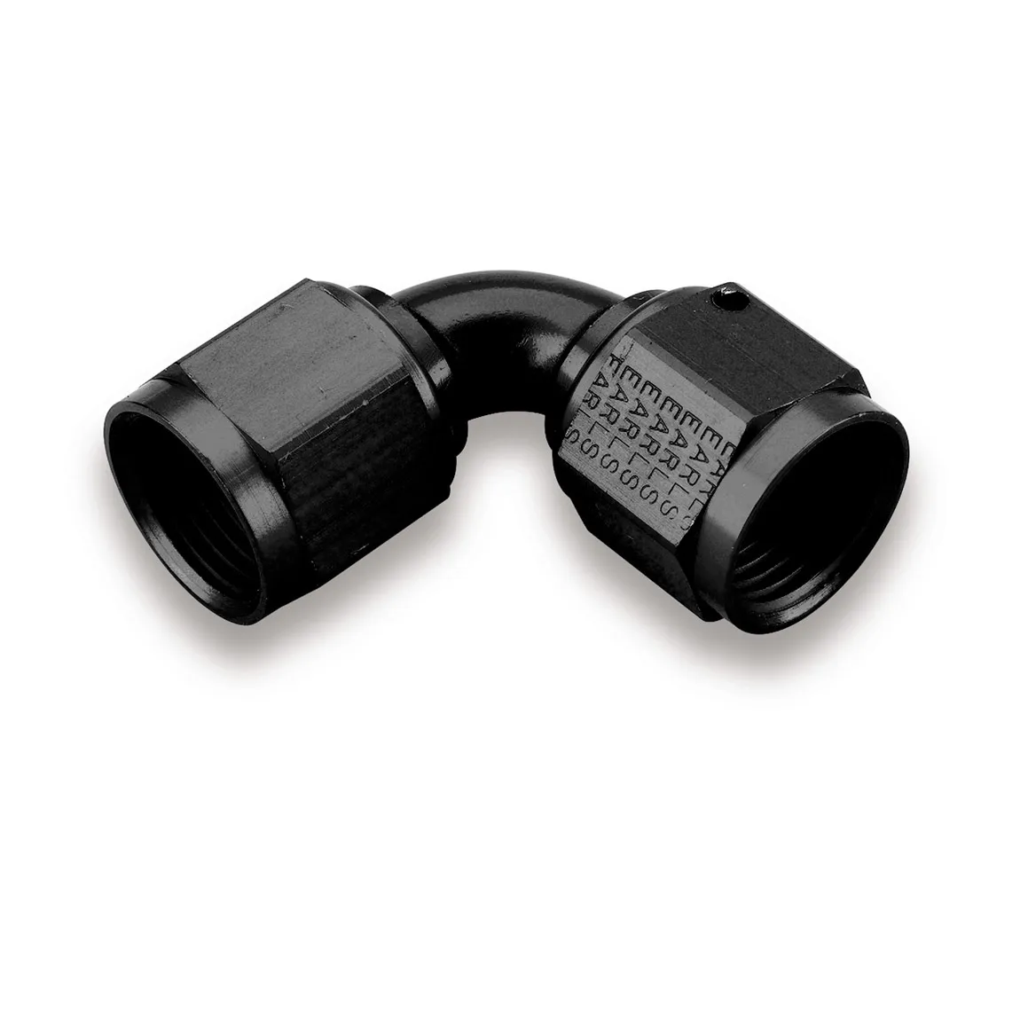 Fitting – Adapter – 90 Degree – 6 AN Female Swivel to 6 AN Female Swivel – Aluminum – Black Anodized – Each