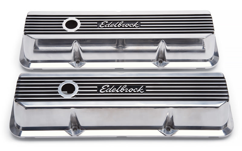 Valve Cover – Elite II – Short – Finned – Breather Hole – Edelbrock Logo – Aluminum – Polished – Ford FE-Series – Pair