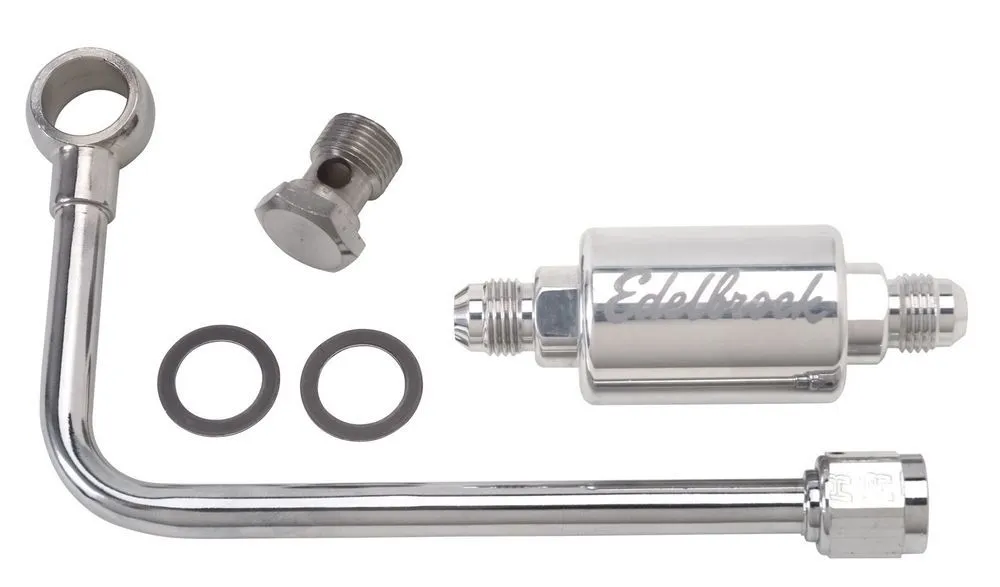 Carburetor Fuel Line – 6 AN Female Inlet – 5/8-20 in Outlet – Polished Filter – Stainless – Chrome – Edelbrock Performer / Thunder AVS Carburetors – Kit