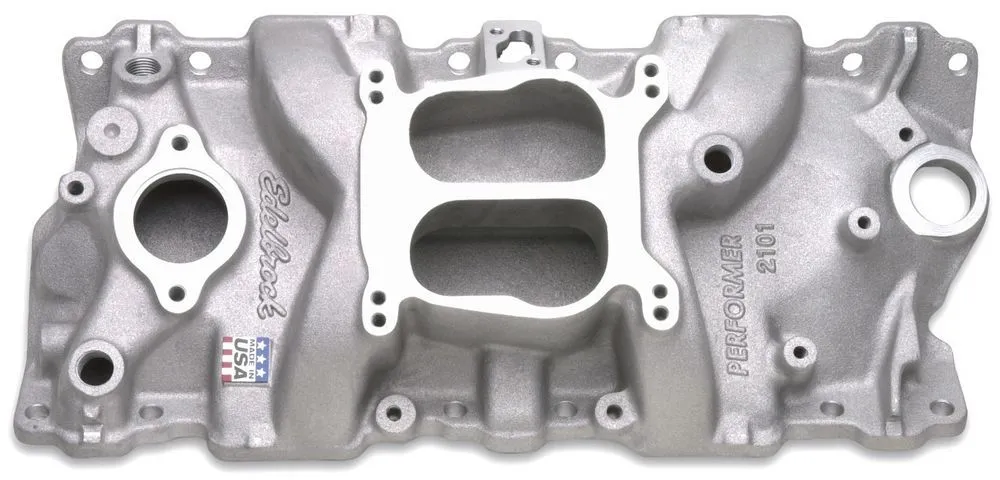 Intake Manifold – Performer 86 and Earlier – Spread / Square Bore – Dual Plane – Aluminum – Natural – Small Block Chevy – Each