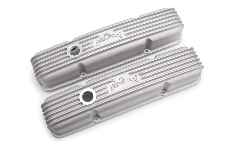 Valve Cover – Classic – Tall – Finned – Breather Hole – Edelbrock Logo – Aluminum – Satin – Small Block Chevy – Pair