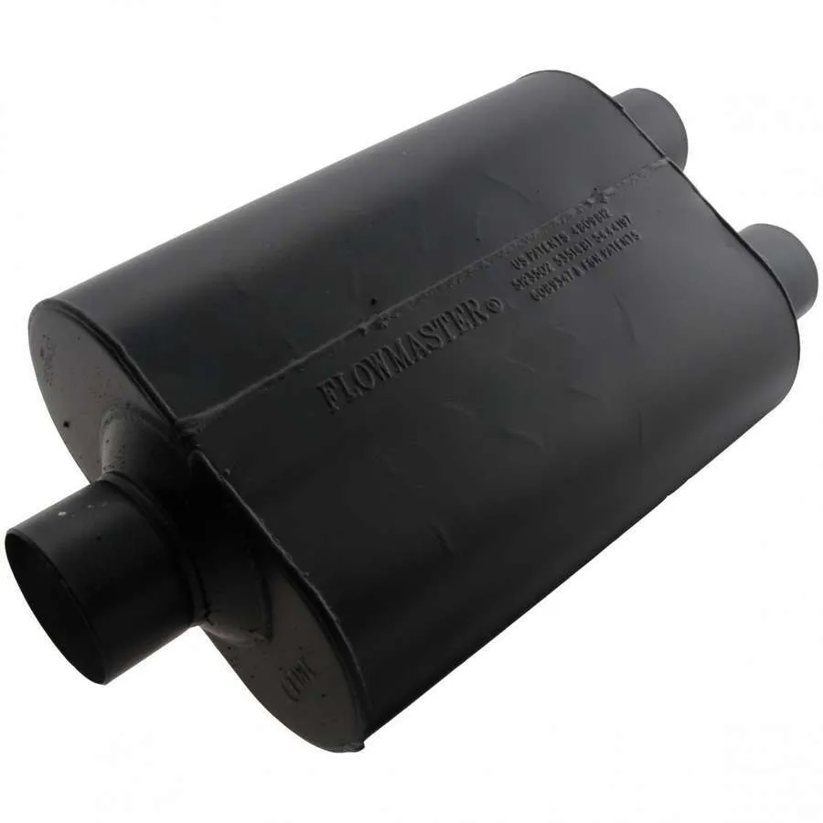 Muffler – Super 40 – 3 in Center Inlet – Dual 2.5 in Outlets – 13.5 x 10 x 5 in Oval Body – 19.5 in Long – Steel – Black Paint – Universal – Each