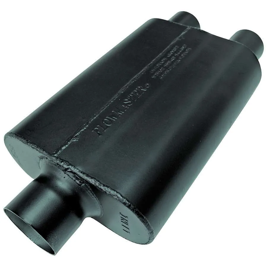 Muffler – Super 44 – 3 in Center Inlet – Dual 2.25 in Outlets – 13 x 9.75 x 4 in Oval Body – 19 in Long – Steel – Black Paint – Each