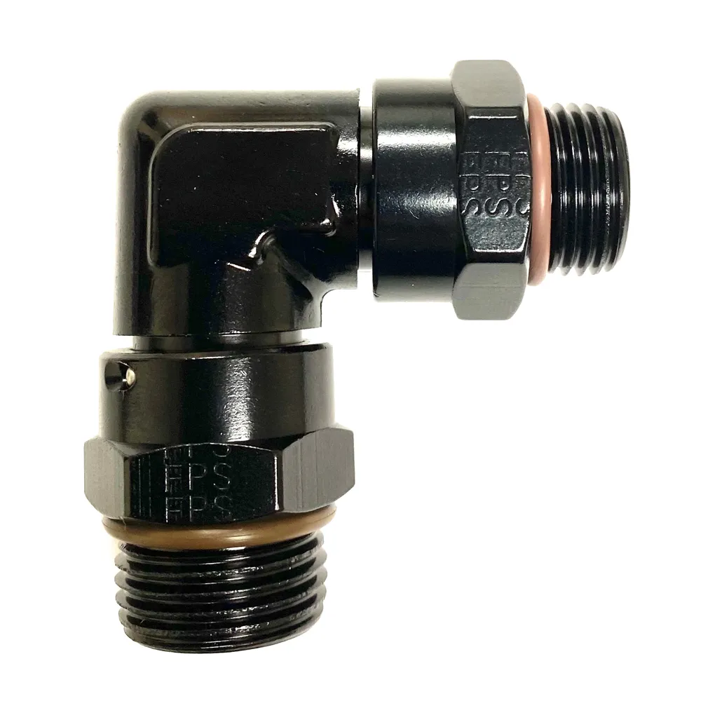 Fitting – Adapter – 90 Degree – 6 AN Male O-Ring Swivel to 6 AN Male O-Ring Swivel – Aluminum – Black Anodized – Each