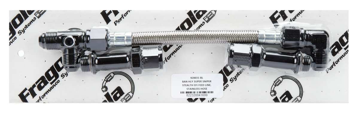 Carburetor Fuel Line – 8 AN Male Inlet – Dual 3/4-16 in Male O-Ring Outlets – Braided Stainless Hose – Aluminum – Black Anodized – Holley Super Sniper – Kit