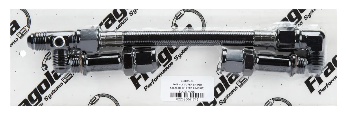 Carburetor Fuel Line – 8 AN Male Inlet – Dual 3/4-16 in Male O-Ring Outlets – Braided Nylon Hose – Aluminum – Black Anodized – Holley Super Sniper – Kit
