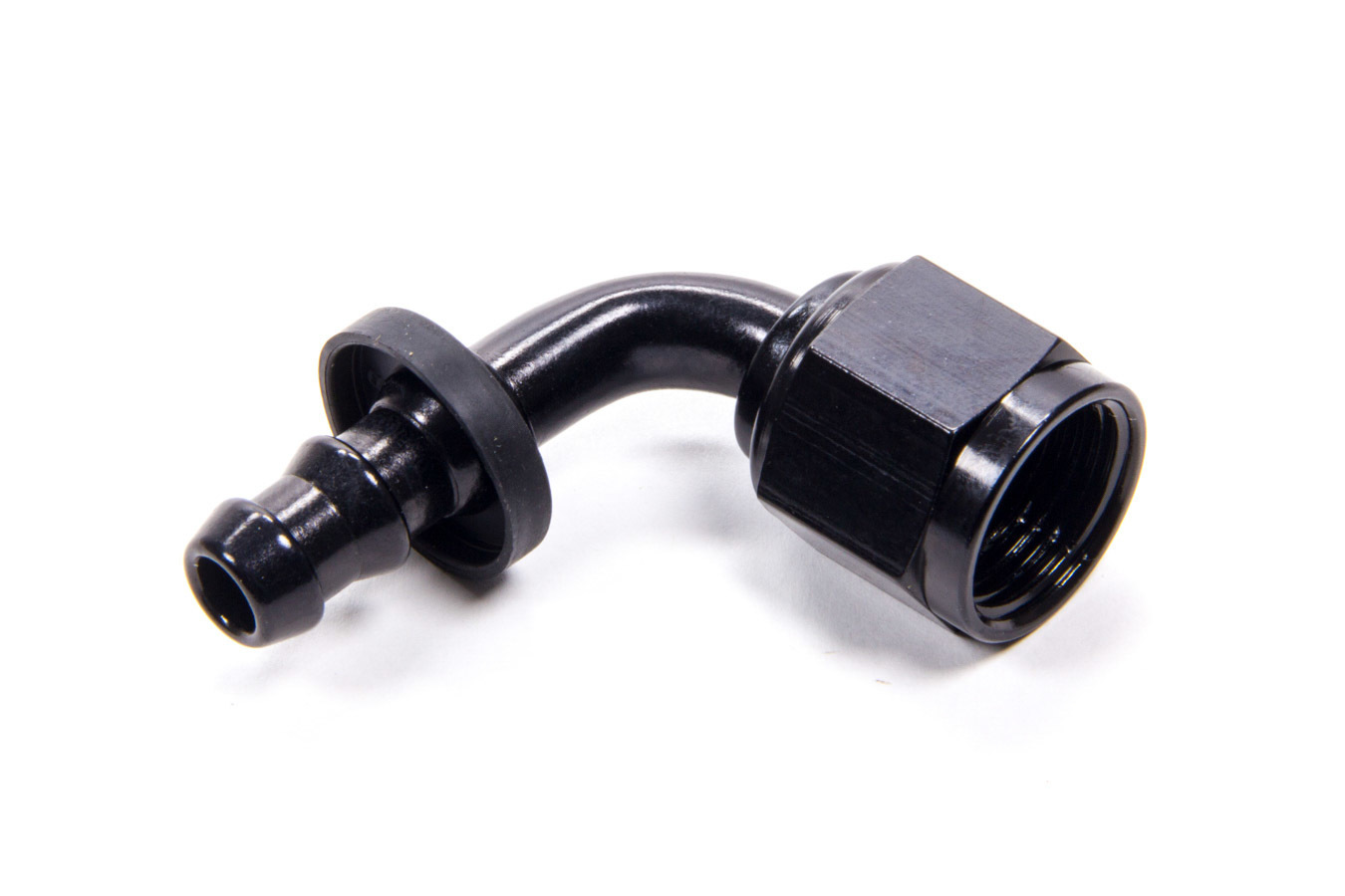 Fitting – Hose End – 8000 Series Push-Lite – 90 Degree – 6 AN Hose Barb to 8 AN Female – Aluminum – Black Anodized – Each