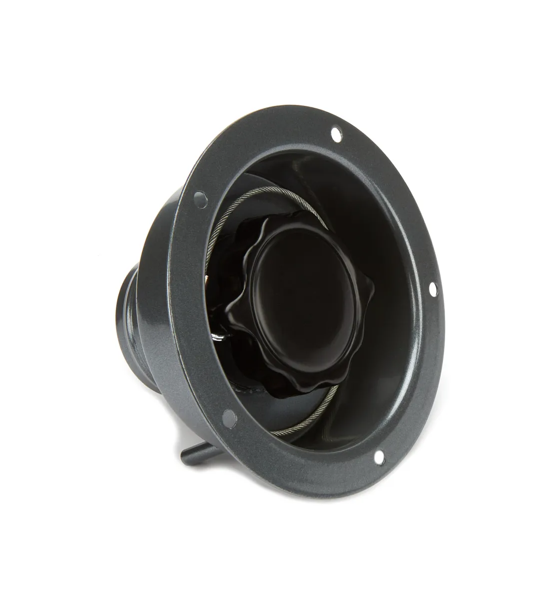 Fuel Filler Cap Assembly – Fender Fill – Twist-Lock Cap – Flush Remote Mount – 6-Bolt Flange – 2-1/4 in Hose Barb – Steel – Black / Gray Paint – Kit