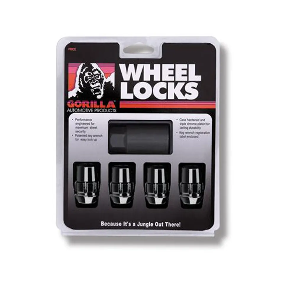Wheel Lock – Gorilla – Acorn – 14 mm x 1.50 Thread – Spline Drive – 60 Degree Seat – Closed End – Key – Heat Treated – Steel – Black Chrome – Set of 4