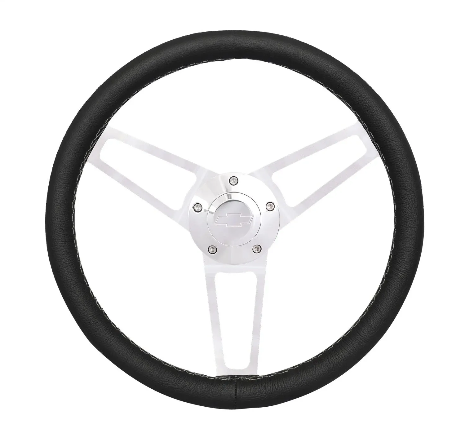 Steering Wheel – Billet Series for Chevrolet – 13.75 in Diameter – Flat – 3-Spoke – Black Leather Grip – Chevrolet Bowtie Logo – Aluminum – Polished – GM 1957-69 – Each