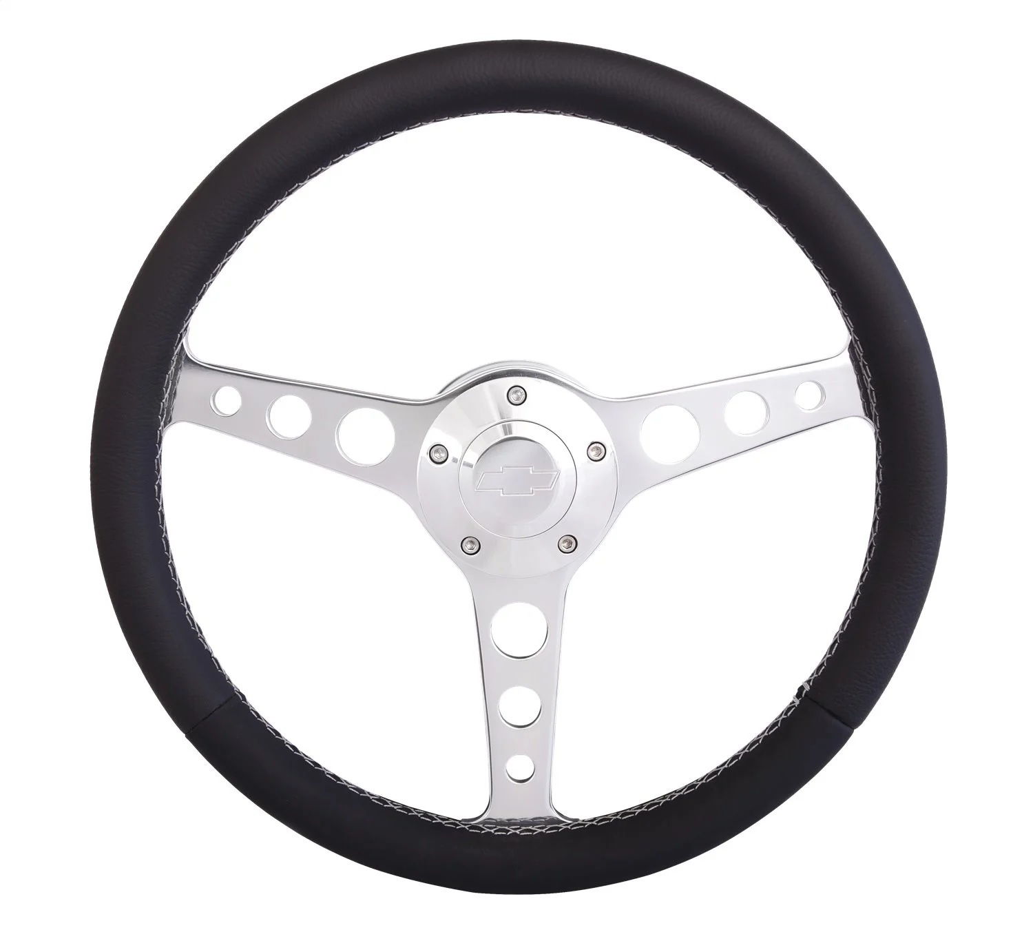 Steering Wheel – Classic Series – 13.75 in Diameter – Flat – 3-Spoke – Black Leather Grip – Chevrolet Bowtie Logo – Aluminum – Polished – GM 1957-69 – Each