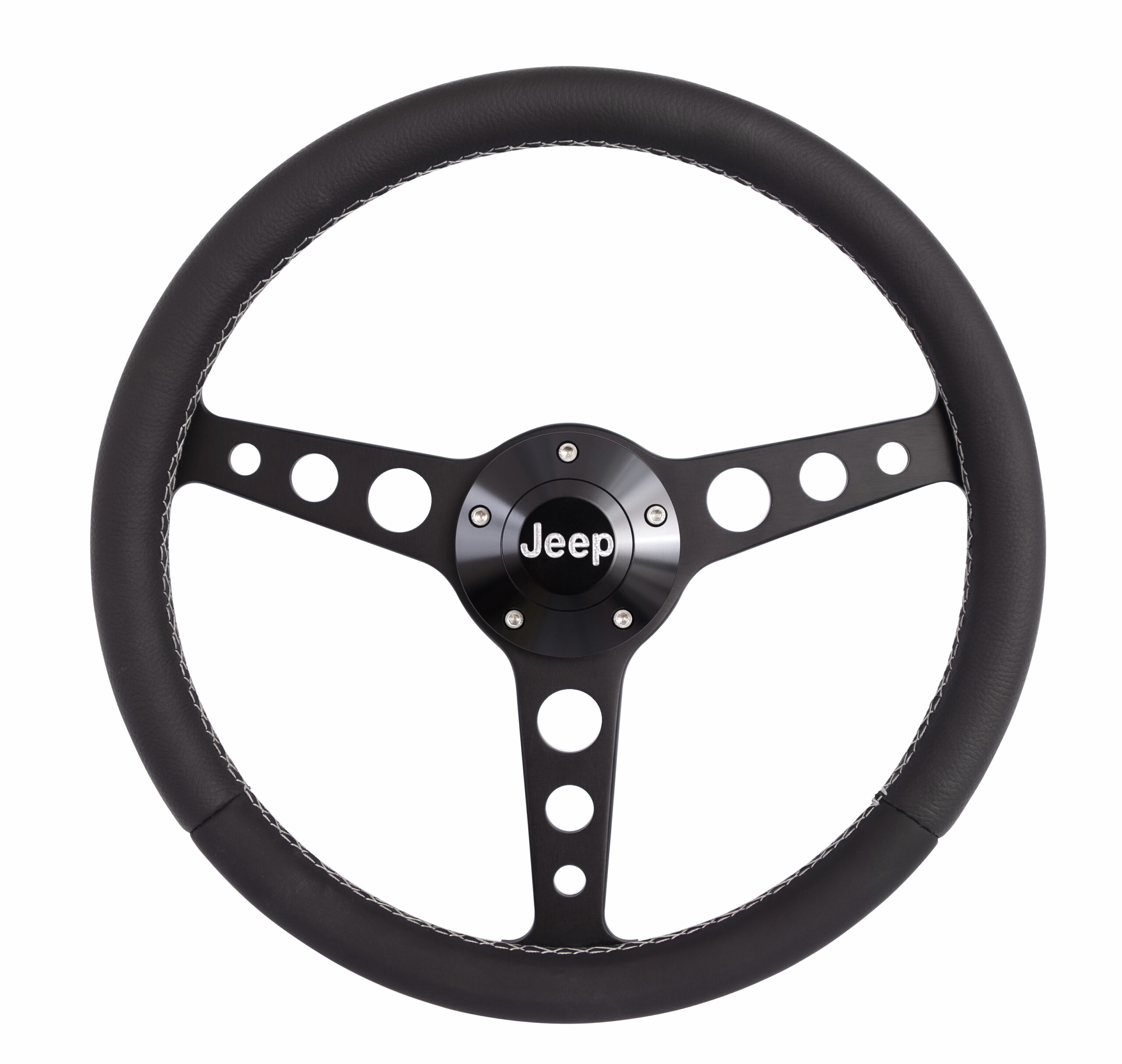 Steering Wheel – Classic Series – 14.75 in Diameter – 1 in Dish – 3 Spoke – Black Leather Grip – Jeep Logo – Aluminum – Black Anodized – Jeep 1974-95 – Each