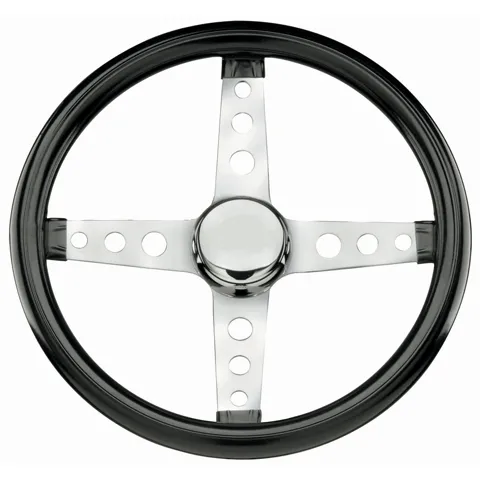 Steering Wheel – Classic Crusin – 13.5 in Diameter – 1.75 in Dish – 4-Spoke – Black Vinyl Grip – Steel – Chrome – Each