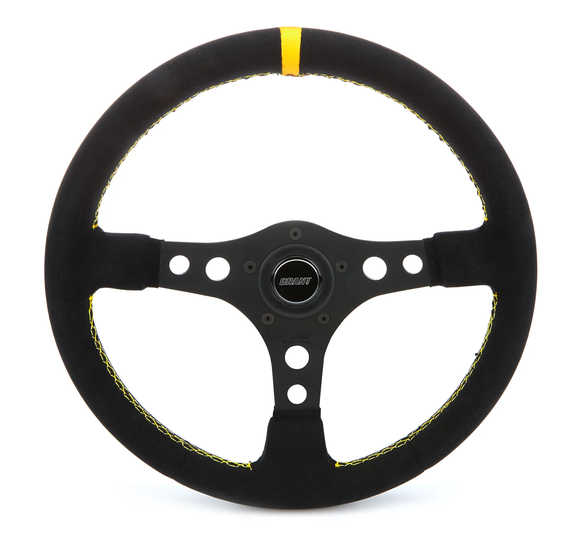 Steering Wheel – 14 in Diameter – 1.75 in Dish – 3-Spoke – Black Suede Grip – Yellow Stripe – Aluminum – Black Anodized – Each