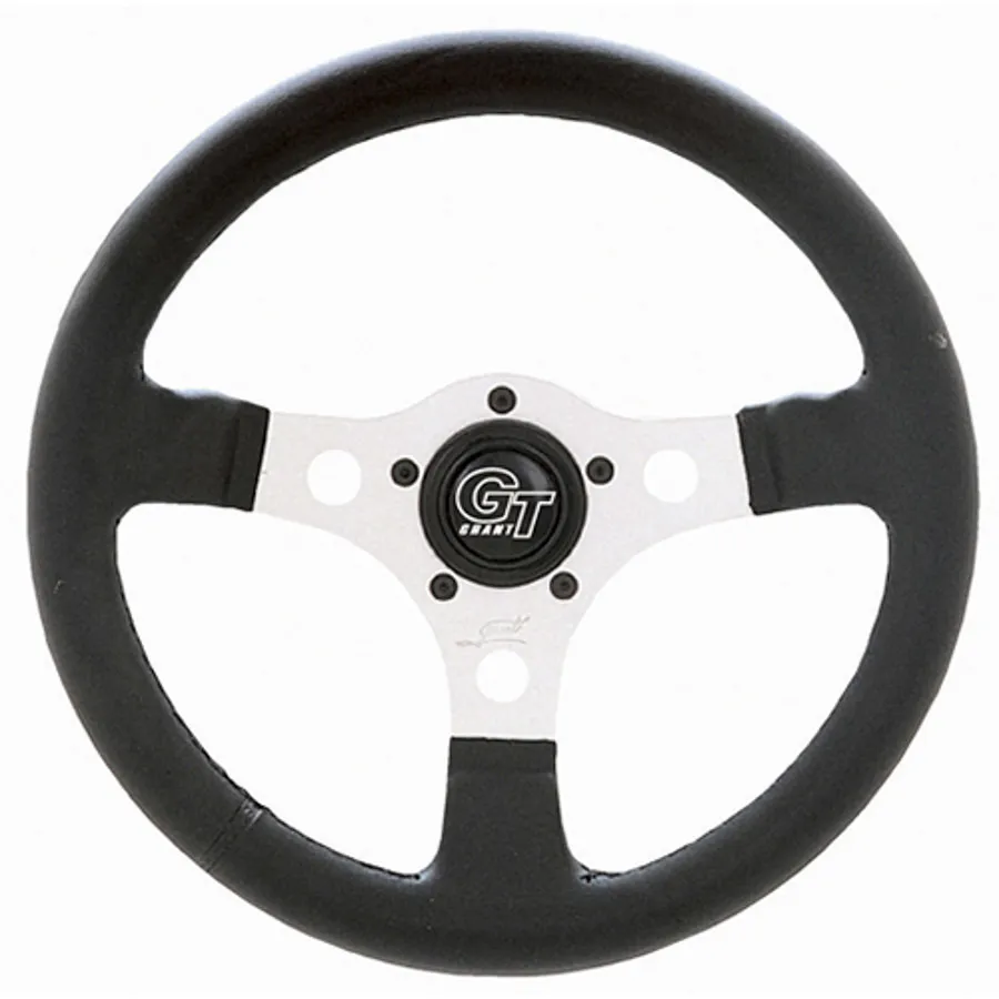 Steering Wheel – Formula GT – 12 in Diameter – 3 in Dish – 3-Spoke – Black Vinyl Grip – Aluminum – Silver Anodized – Each