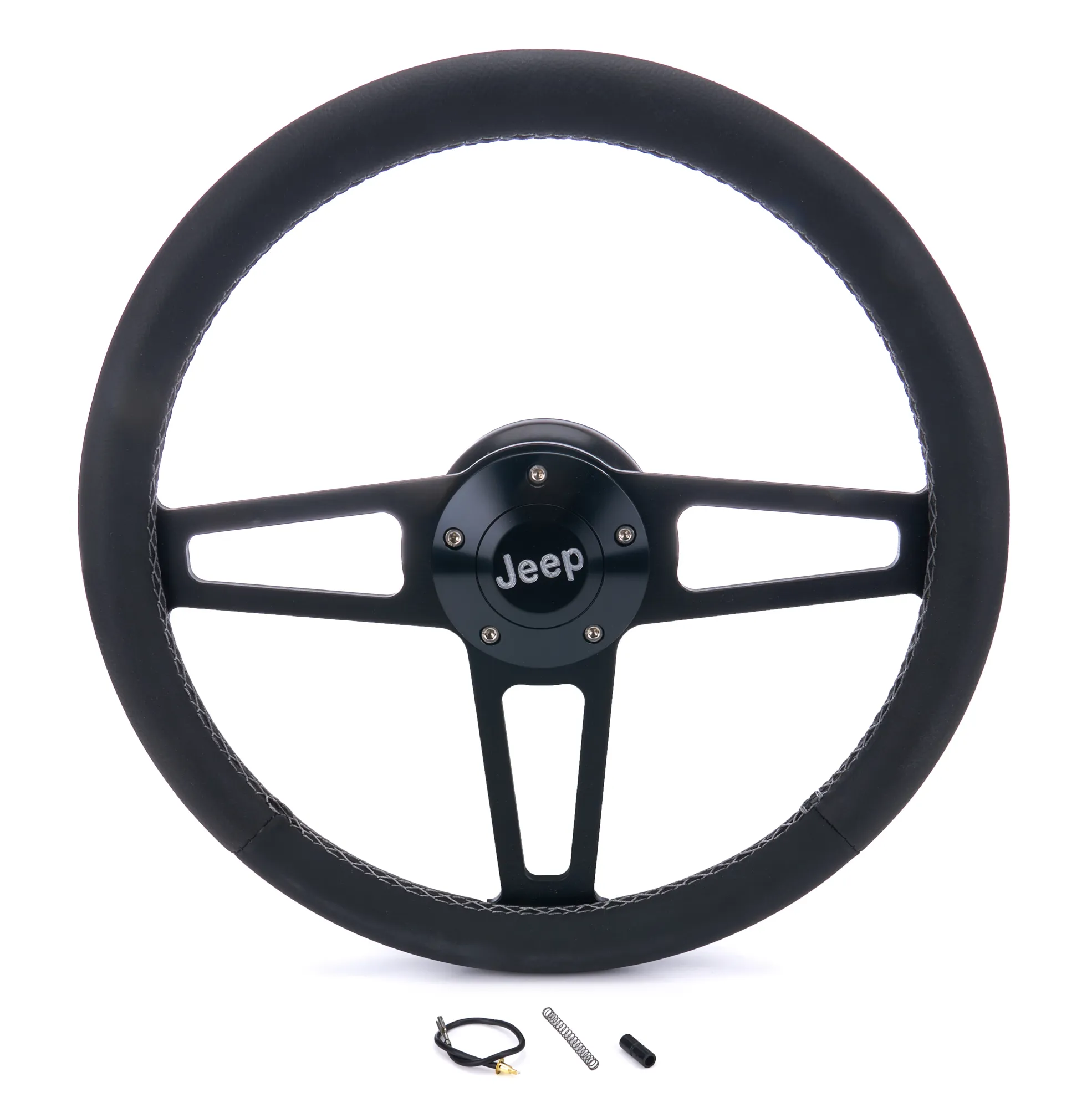 Steering Wheel – T Series – 14 in Diameter – 1 in Dish – 3 Spoke – Black Leather Grip – Jeep Logo – Aluminum – Black Anodized – Each
