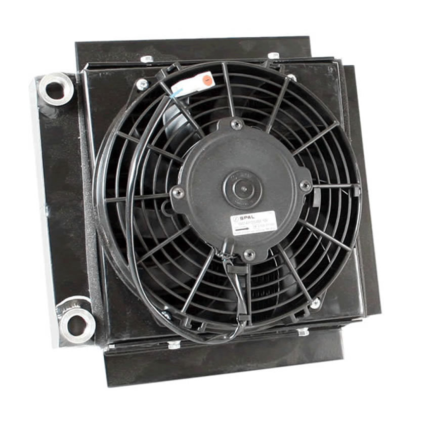 Fluid Cooler and Fan – 12.06 x 12.47 x 6.39 in – Plate Type – 1/2 in NPT Female Inlet / Outlet – Aluminum – Black Powder Coat – Universal – Each