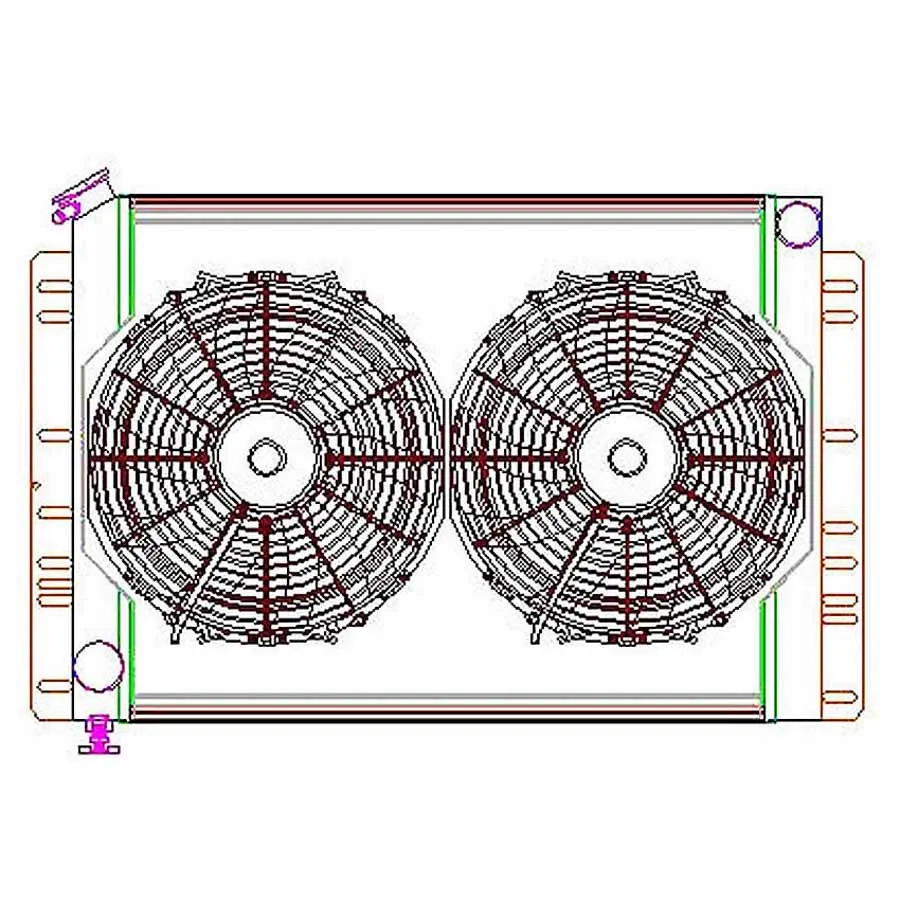 Radiator and Fan – Direct Fit – 26.5 in W x 18.688 in H x 7.188 in D – Passenger Side Inlet – Driver Side Outlet – Aluminum – Natural – Mopar – Kit