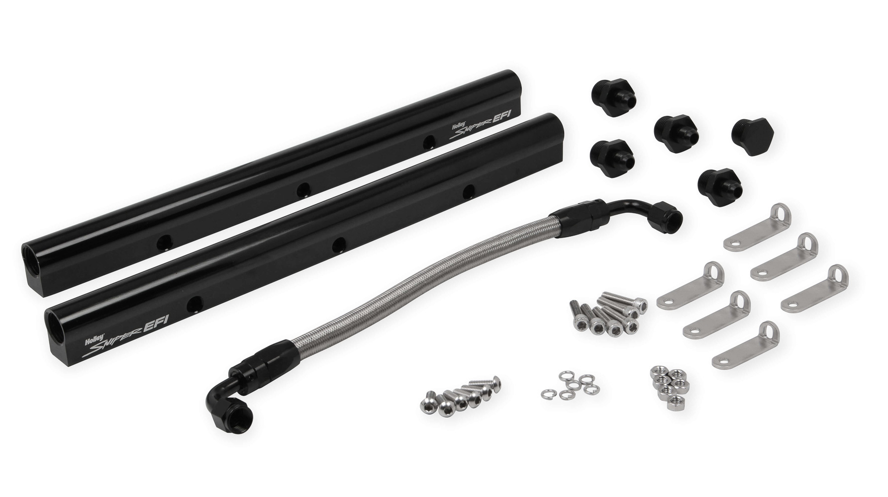 Fuel Rail – Sniper EFI – 8 AN Female O-Ring Inlets – 8 AN Female O-Ring Outlets – Aluminum – Black Anodized – Hardware Included – Holley LS3 / L92 Intakes – GM LS-Series – Kit