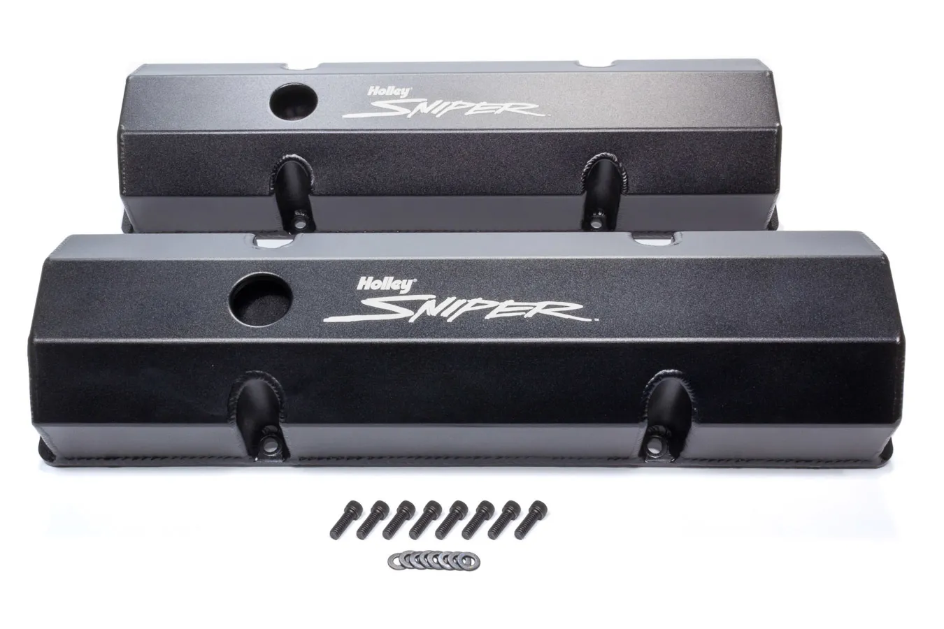 Valve Cover – Sniper – Tall – Baffled – Breather Holes – Sniper Logo – Fabricated Aluminum – Black Powder Coat – Small Block Chevy – Pair