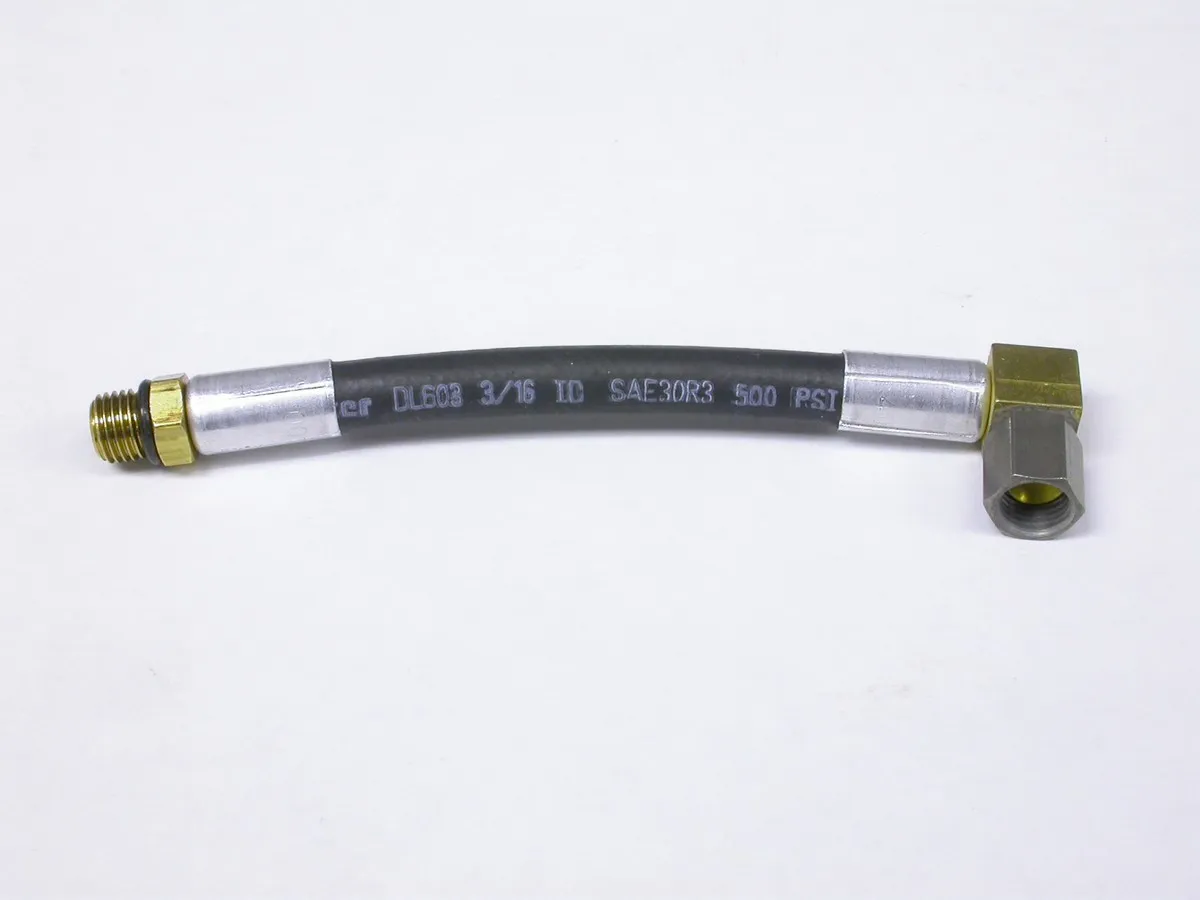 Fuel Injector Line – 7 in Long – 3 AN Hose – 3 AN 90 Degree Female to 3 AN Straight O-Ring – Brass / Rubber / Stainless – Black / Natural – Each
