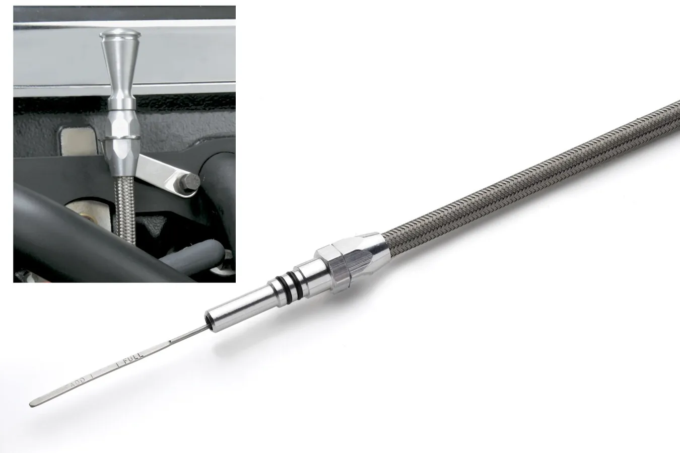 Engine Oil Dipstick – Pan Mount – Braided Stainless Housing – Aluminum – Clear Anodized – Small Block Ford – Each