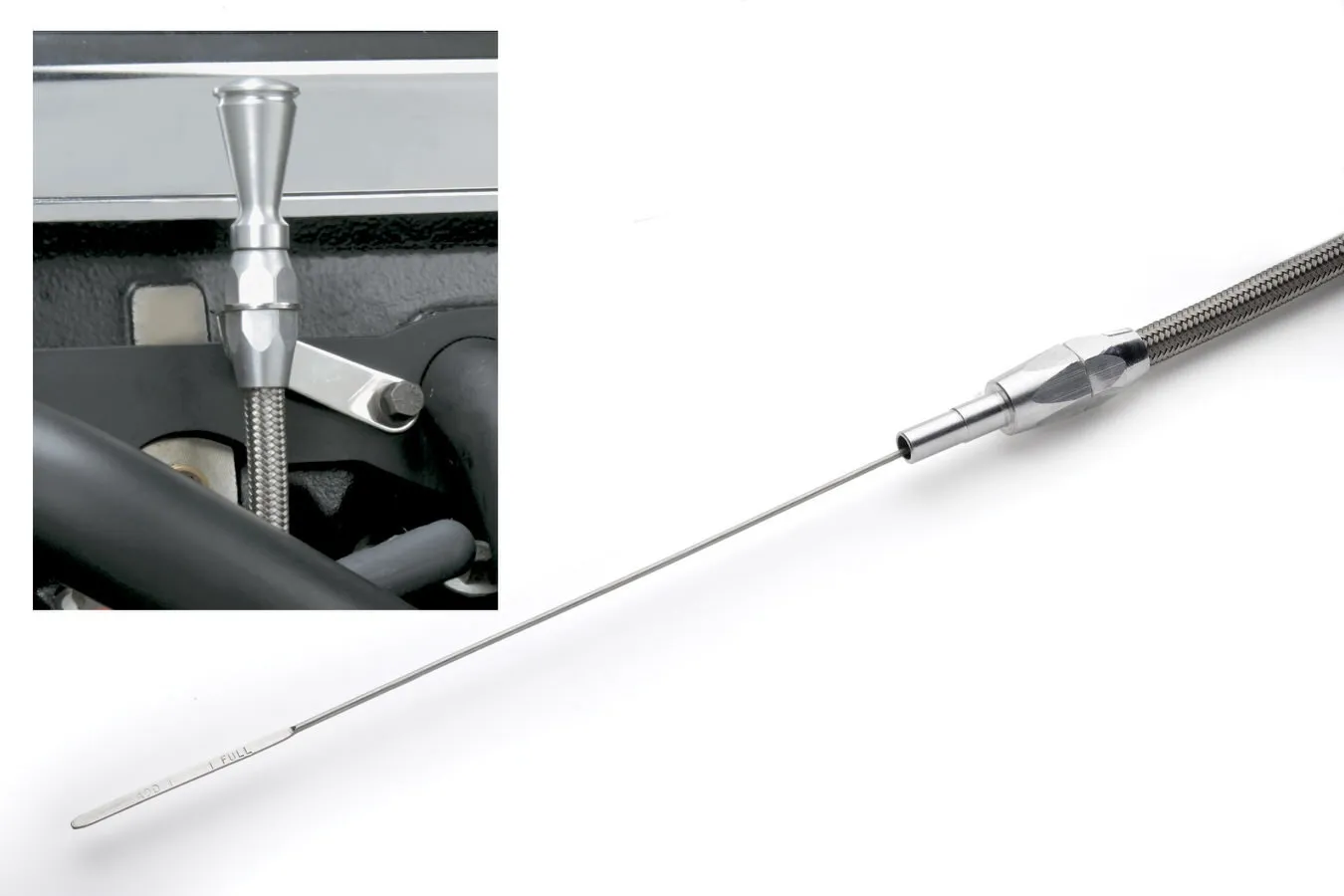 Engine Oil Dipstick – Block Mount – Braided Stainless Housing – Aluminum – Clear Anodized – Ford FE-Series – Each