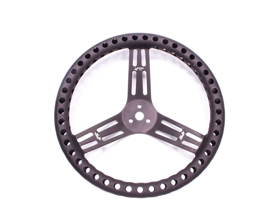 Steering Wheel – Lightweight – 14 in Diameter – 2.5 in Dish – 3-Spoke – Drilled / Shot Peened Grip – Aluminum – Black Anodized – Each