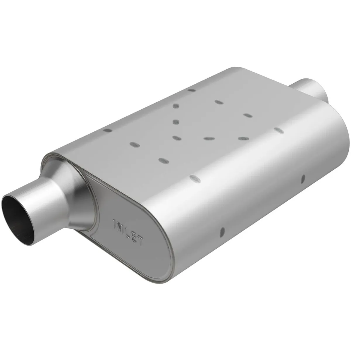 Muffler – Rumble – 2.5 in Offset Inlet – 2.5 in Center Outlet – 13 x 4.25 x 9.5 in Oval Body – 18.5 in Long – Stainless – Natural – Universal – Each