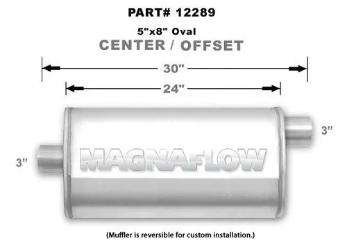 Muffler – 3 in Center Inlet – 3 in Offset Outlet – 24 x 8 x 5 in Oval Body – 30 in Long – Stainless – Natural – Universal – Each