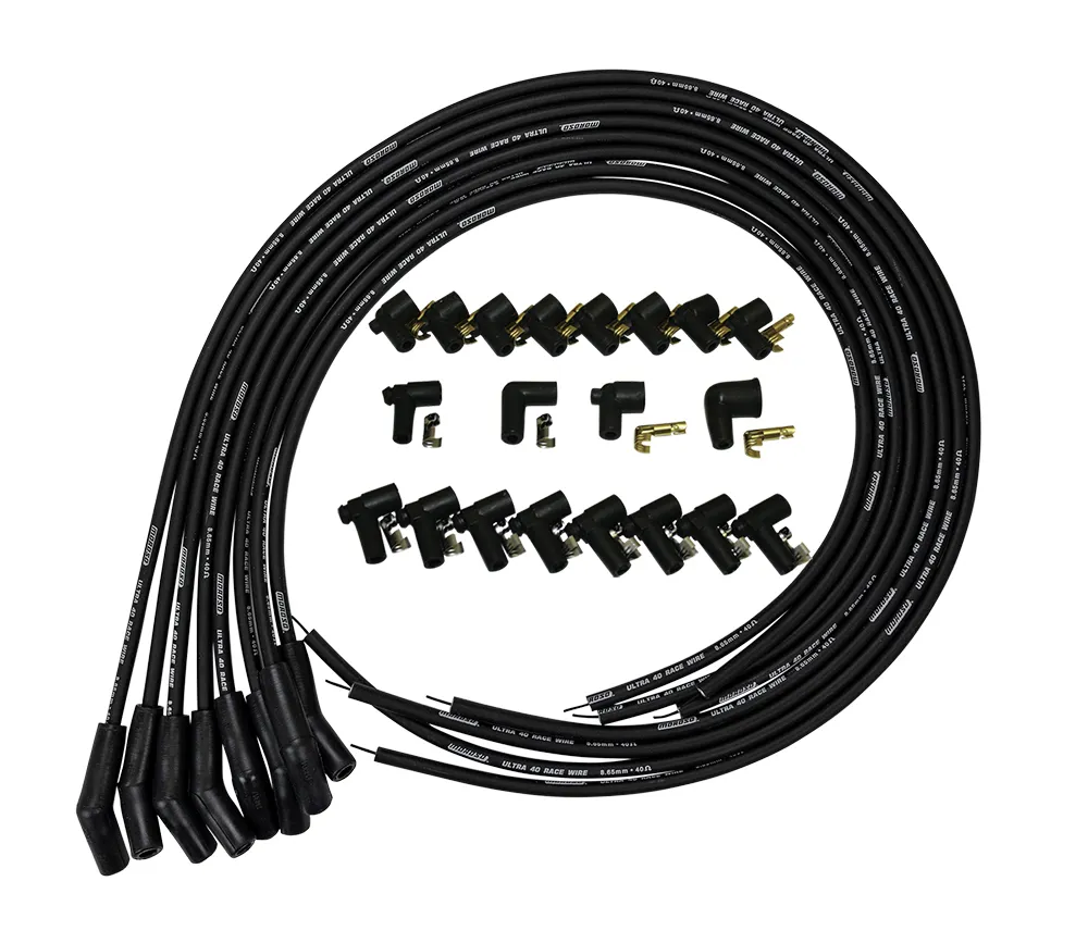 Spark Plug Wire Set – Ultra 40 – Spiral Core – 8.65 mm – Black – 135 Degree Plug Boots – HEI / Socket Style – Cut-To-Fit – V8 – Kit