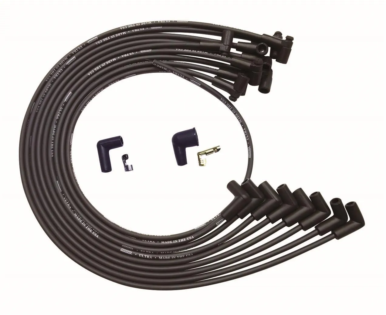 Spark Plug Wire Set – Ultra – Spiral Core – 8 mm – Black – 90 Degree Plug Boots – HEI Style Terminal – Under The Header – Big Block Chevy – Kit