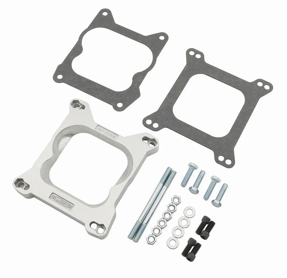 Carburetor Adapter – 0.75 in Thick – Open – Square Bore to Spread Bore – Gaskets / Hardware Included – Aluminum – Natural – Each