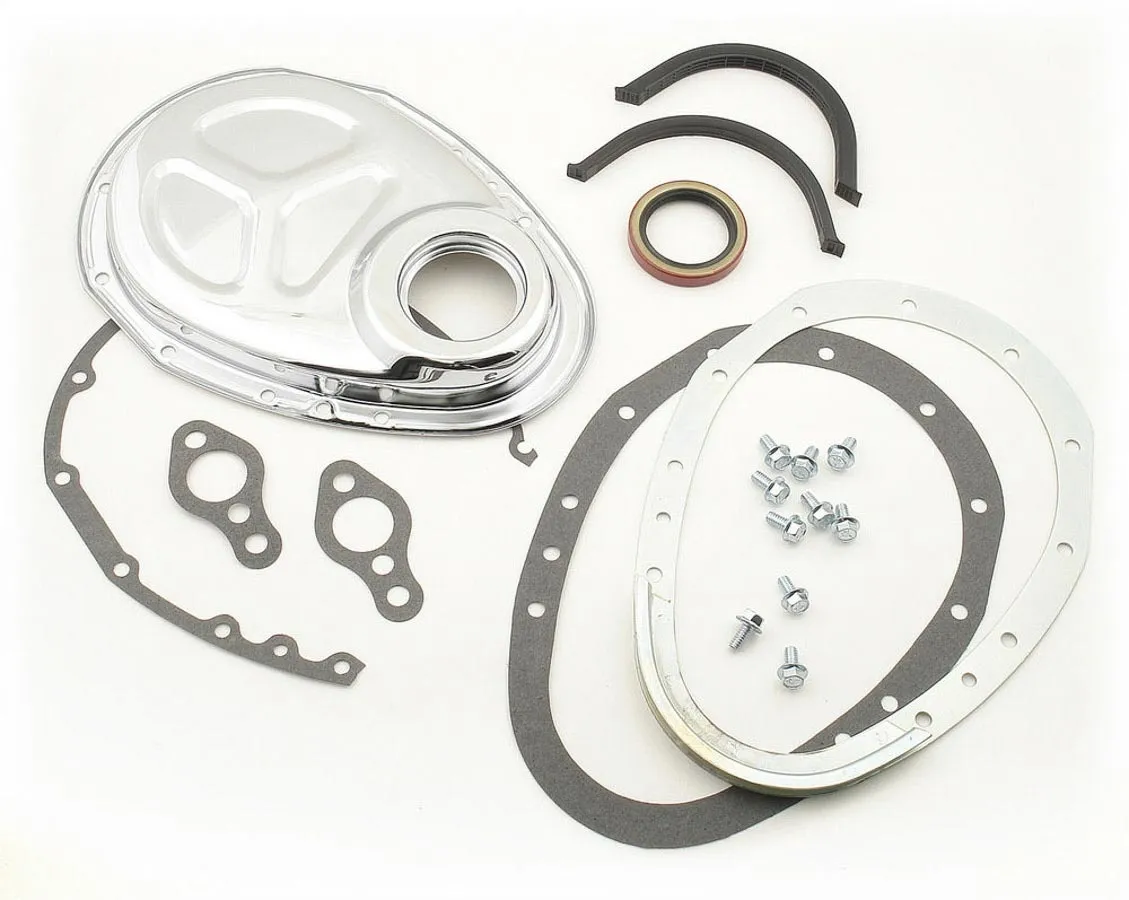 Timing Cover – 2-Piece – Gaskets / Hardware / Seal Included – Steel – Chrome – Small Block Chevy / GM V6 – Each