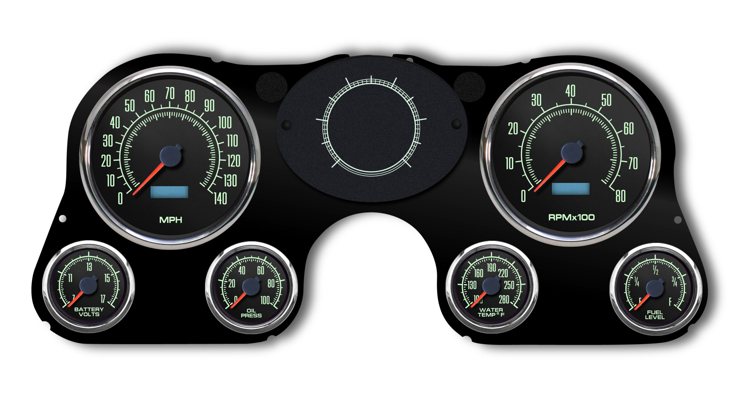 New Vintage USA specializes in custom gauges. They have a full line of gauges in styles and formats that range from art deco vintage to modern muscle, to fit a wide range of vehicles.