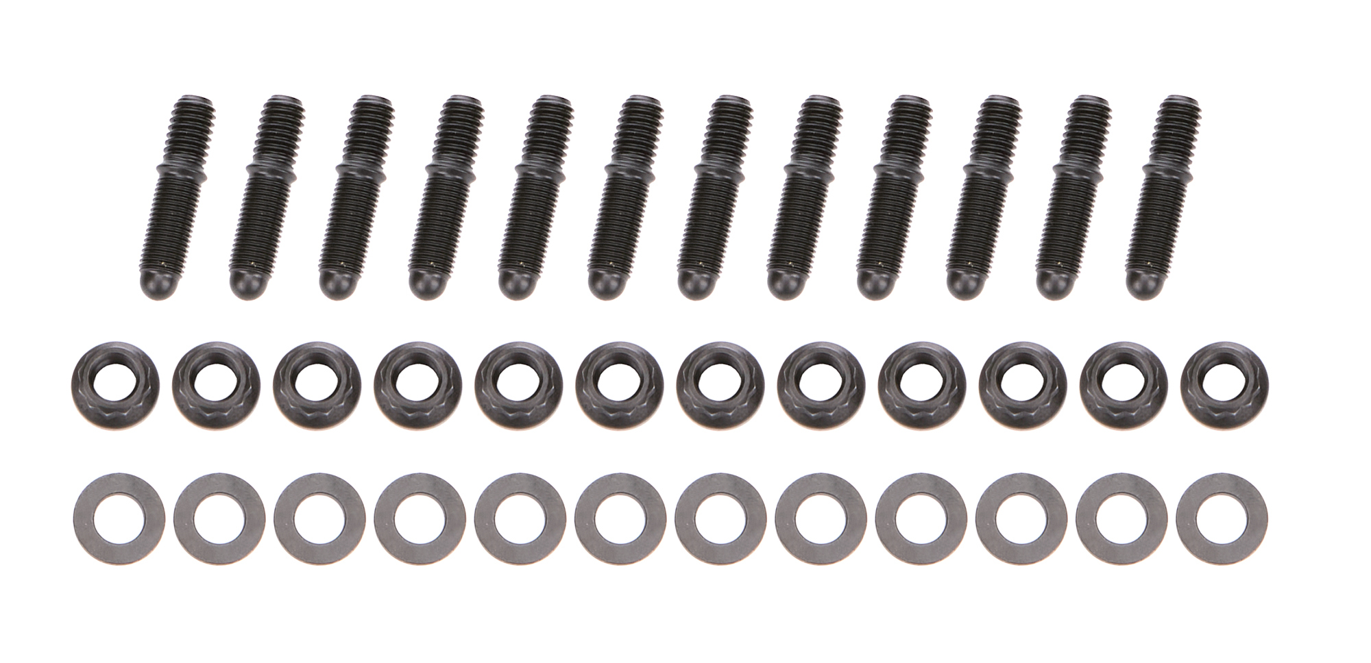 Header Stud – 3/8-16 and 3/8-24 in Thread – 1.675 in Long – Nuts Included – Broached – Small Journal – Steel – Black Oxide – Small Block Chevy – Set of 12