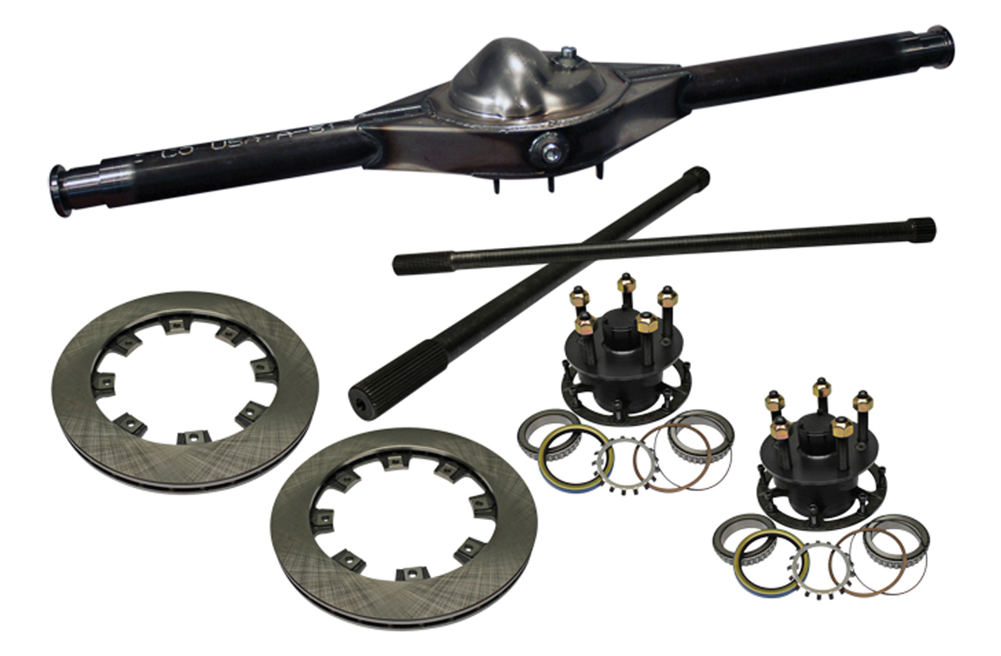 Rear Axle Housing – Ford 9 in Floater – 58 in Wide – Centered – 3 in Tubes – 2.5 in GN Hubs – Rotors Included – Steel – Natural – Each