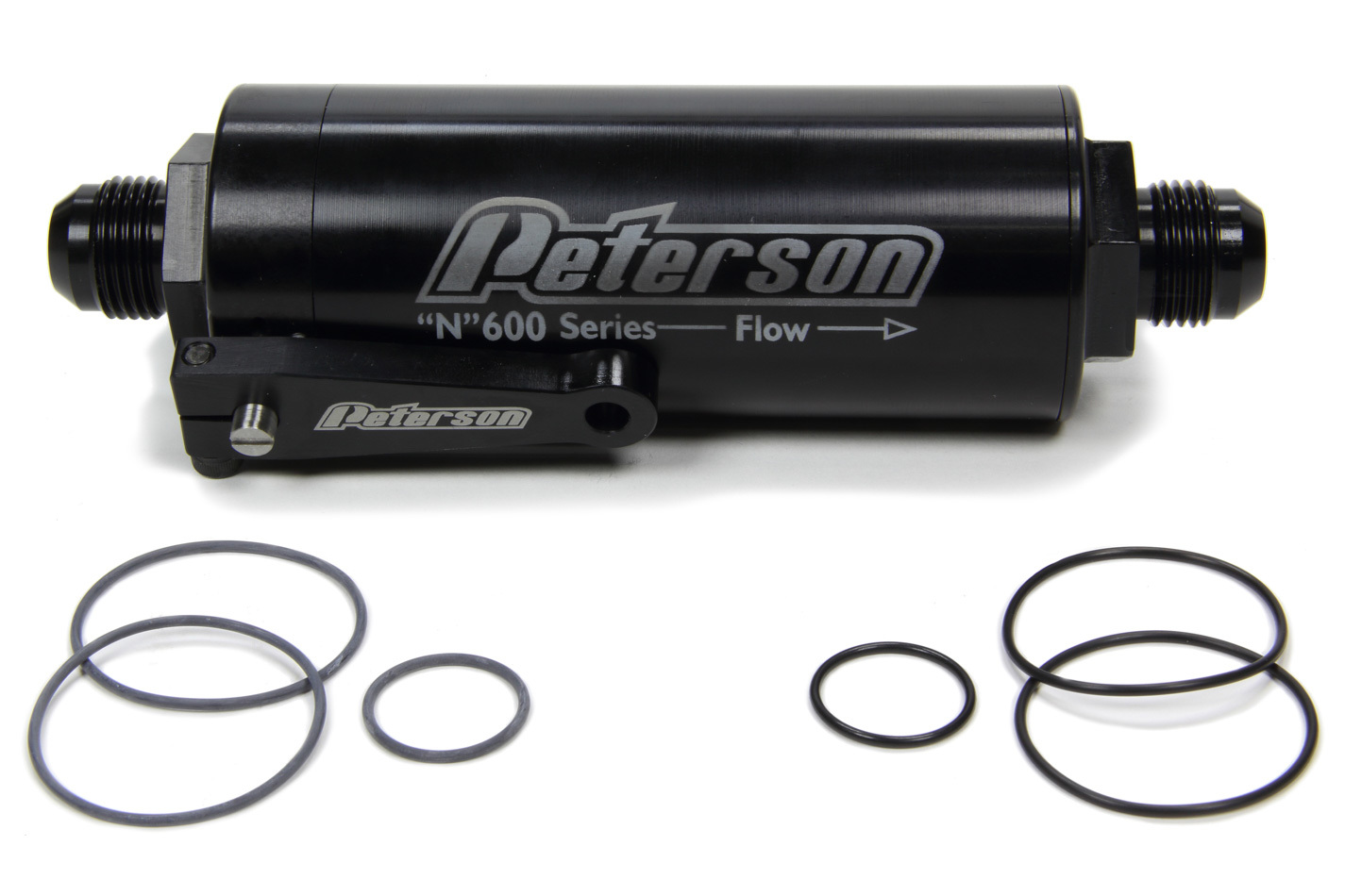 Fuel Filter – 600 Series – In-Line – 60 Micron – Stainless Element – 10 AN Male Inlet – 10 AN Male Outlet – Shut Off Valve – Aluminum – Black Anodized – Each