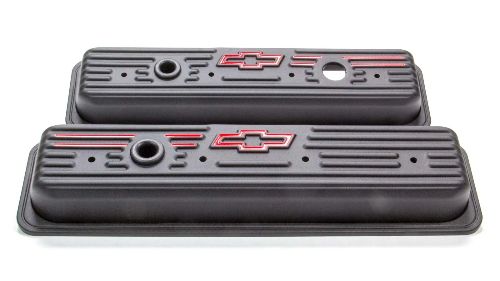 Valve Cover – Short – Ribbed – Baffled – Breather Hole – Chevy Bowtie Logo – Steel – Black Crinkle – Center Bolt – Small Block Chevy – Pair