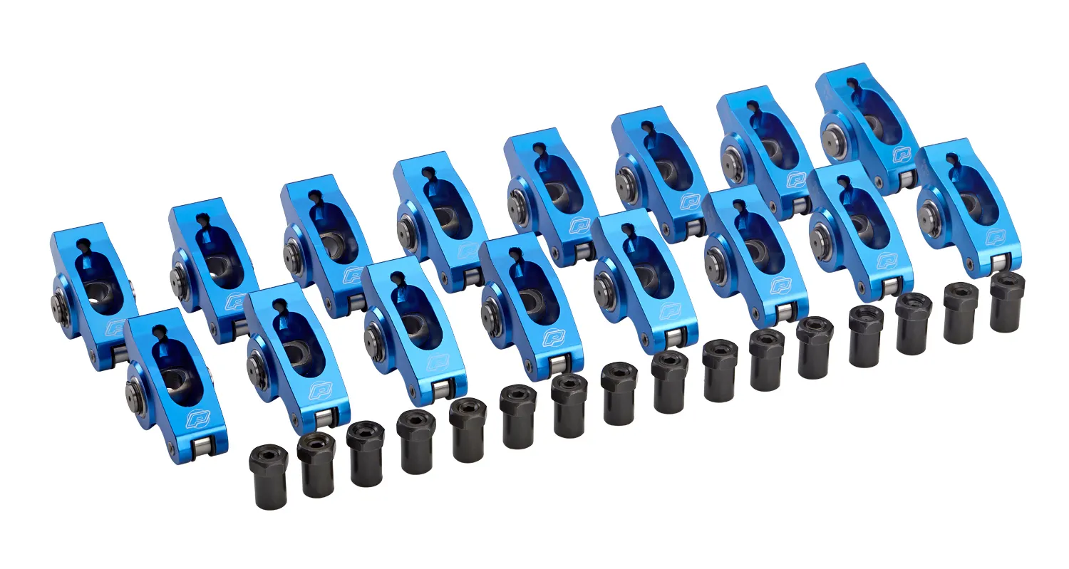 Rocker Arm – 3/8 in Stud Mount – 1.50 Ratio – Full Roller – Self-Align – Aluminum – Blue Anodized – Small Block Chevy – Set of 16