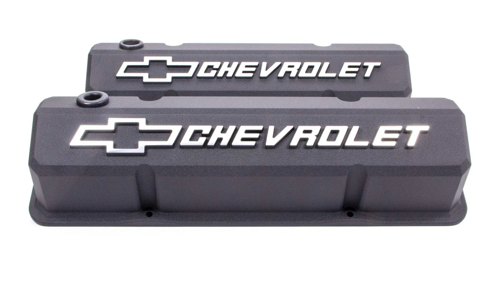 Valve Cover – Slant-Edge – Tall – Baffled – Breather Hole – Raised Chevrolet Bowtie Logo – Aluminum – Black Crinkle Powder Coat – Small Block Chevy – Pair