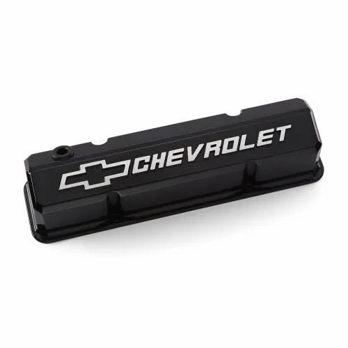 Valve Cover – Slant-Edge – Tall – Baffled – Breather Hole – Raised Chevrolet Bowtie Logo – Aluminum – Black Powder Coat – Small Block Chevy – Pair
