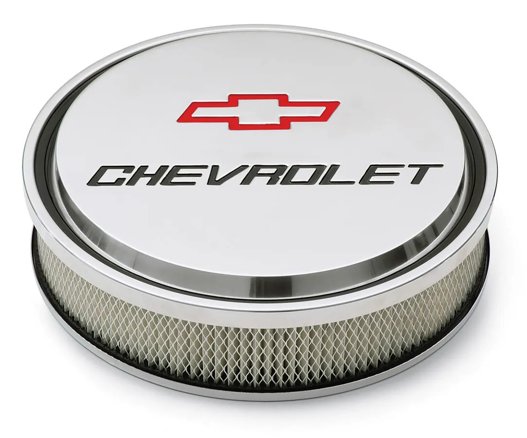 Air Cleaner Assembly – Slant Edge – 14 in Round – 3 in Element – 5-1/8 in Carb Flange – Drop Base – Chevy Bowtie Logo – Aluminum – Polished – Kit