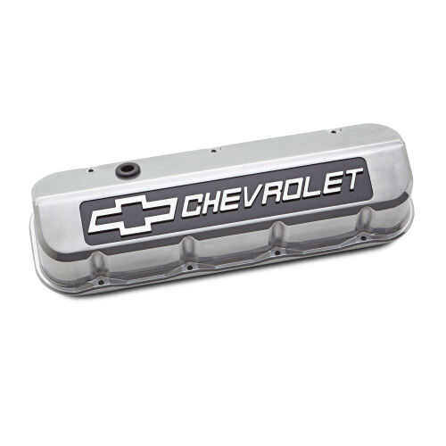 Valve Cover – Slant-Edge – Tall – Baffled – Breather Hole – Blackfield Chevrolet Logo – Aluminum – Polished – Big Block Chevy – Pair