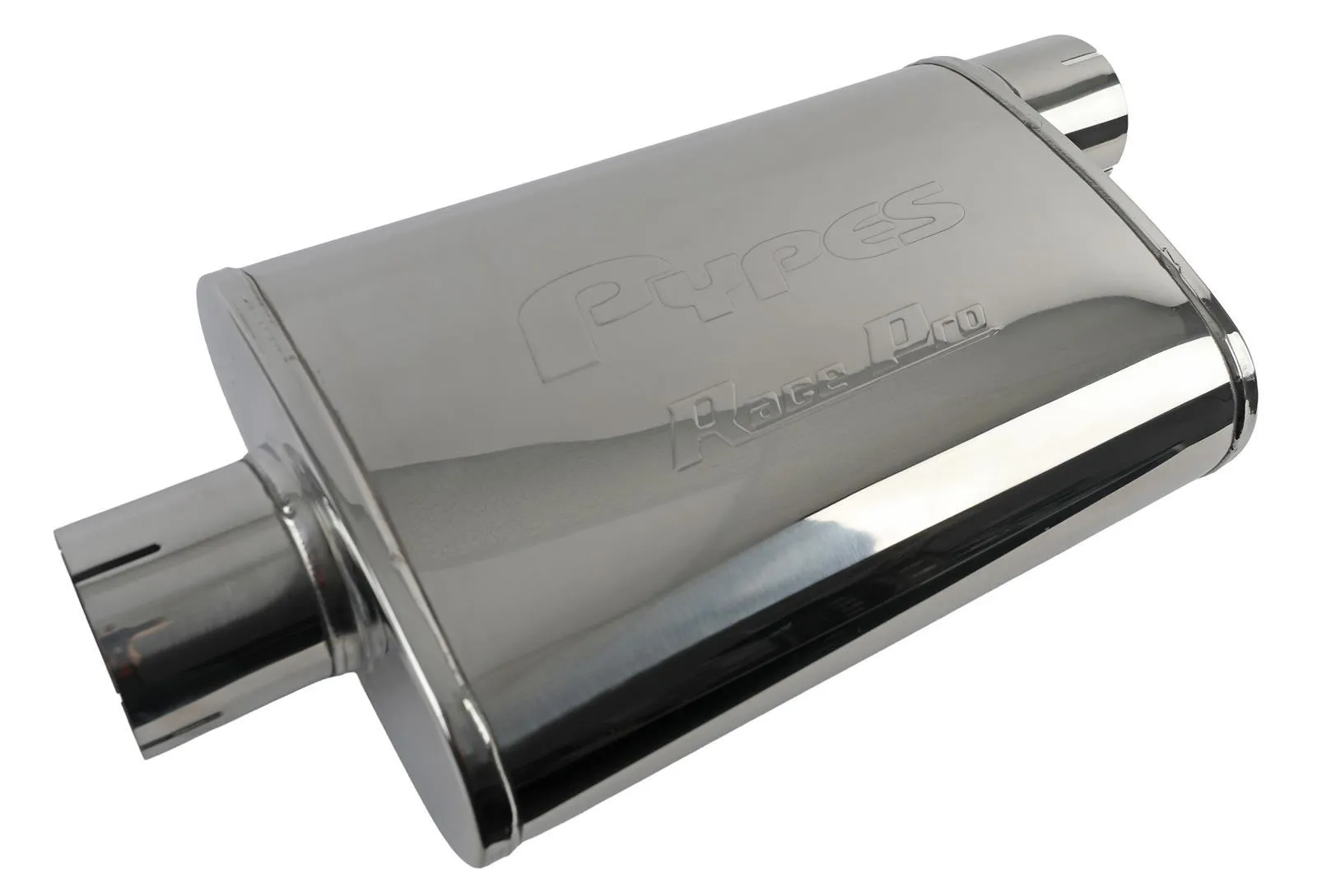 Muffler – Race Pro – 3 in Offset Inlet – 3 in Center Outlet – 9.5 in x 4.5 in Oval Body – 14 in Long – Stainless – Each